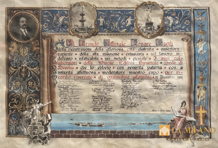 A distanza di 100 anni, sarà esposta al pubblico fino al 31 gennaio, presso la Biblioteca “T. Cannizzaro” al Palacultura, la Pergamena donata lo scorso anno al Comune di Messina dal pronipote del Grand’Ufficiale Cesare Cagli, inviato speciale del Governo a Messina per la ricostruzione post-terremoto, che la ricevette prima del suo ritorno a Roma, dai suoi collaboratori dell’Unione Edilizia Nazionale.