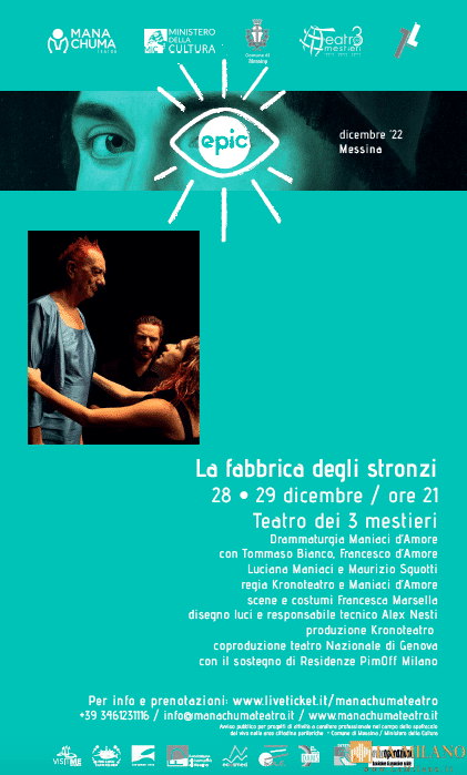 Sarà “La Fabbrica degli Stronzi” di Kronoteatro e Maniaci d’Amore a concludere EPIC (Esperienze Performative di Impegno Civile). Lo spettacolo è in programma mercoledì 28 e giovedì 29 dicembre alle ore 21.00 al Teatro dei 3 Mestieri.